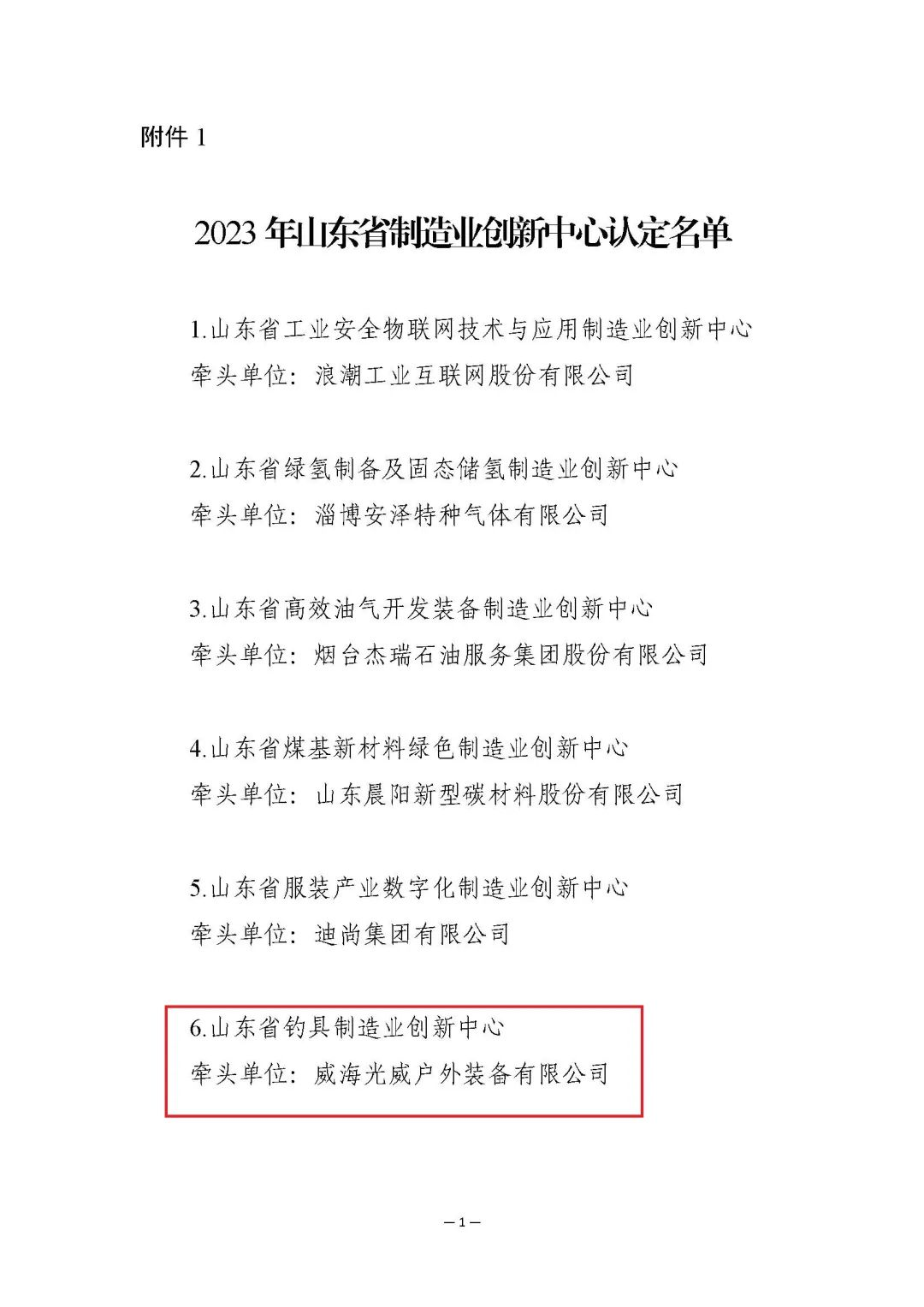 近日,省工業(yè)和信息化廳組織開展了山東省制造業(yè)創(chuàng)新中心認定和培育工作。經(jīng)企業(yè)申報、市級推薦、專家論證等程序,由威海光威戶外裝備有限公司牽頭建設(shè)的山東省釣具制造業(yè)創(chuàng)新中心被認定為2023年山東省制造業(yè)創(chuàng)新中心。